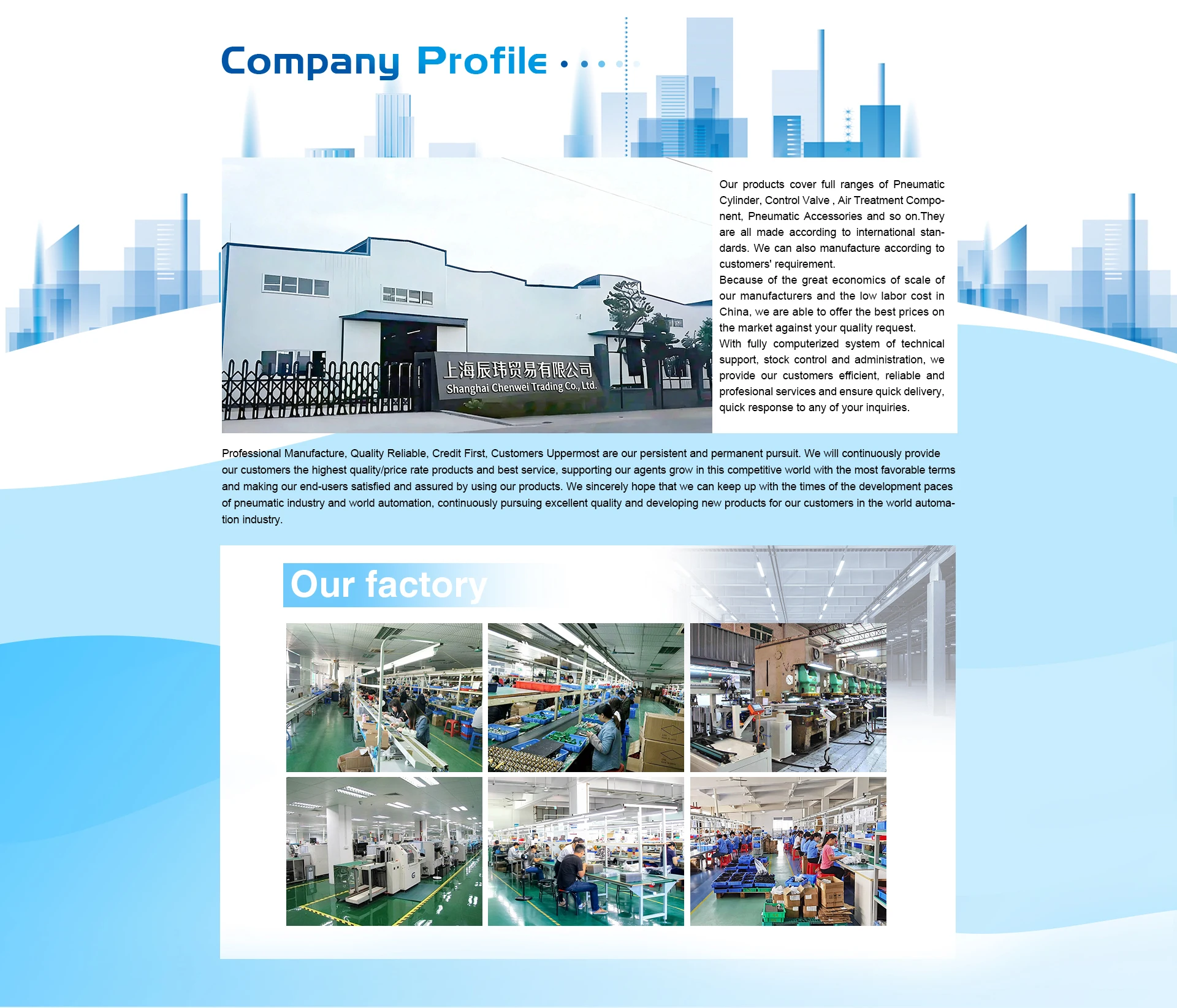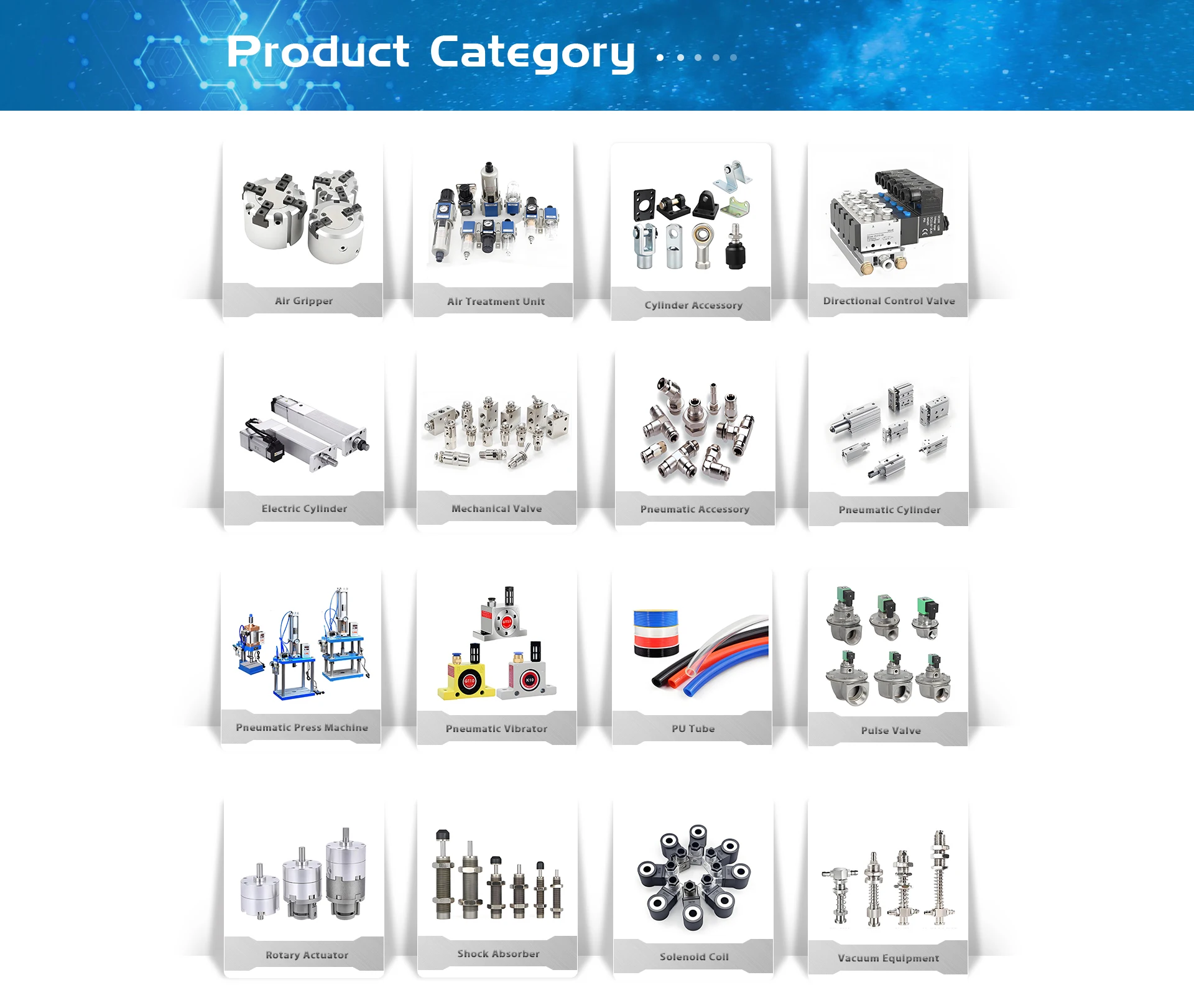 Main categories: pneumatic cylinder,solenoid valve,air source treatment unit,pneumatic fitting,pneumatic PU tube